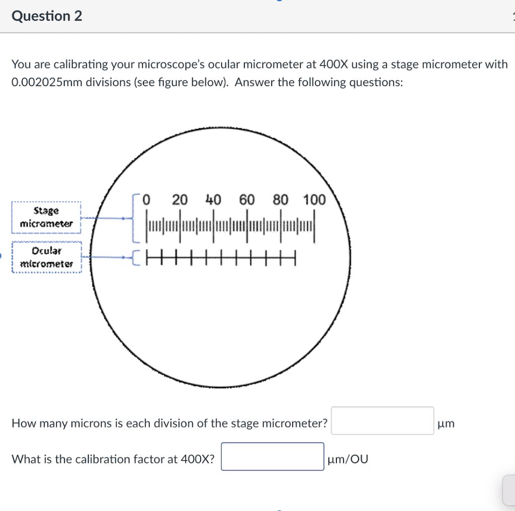 Solved 14a. What is the length in um of the ocular What Is The Purpose Of Using An Ocular Micrometer This is a simple and precise method for measuring objects seen in the microscope. To measure an object seen in a microscope, an ocular micrometer serves as a scale or rule. The ocular micrometer is placed in. A stage micrometer is simply a microscope slide with a. The ocular micrometer is a ruler located in one of the ocular lenses. What Is The Purpose Of Using An Ocular Micrometer.